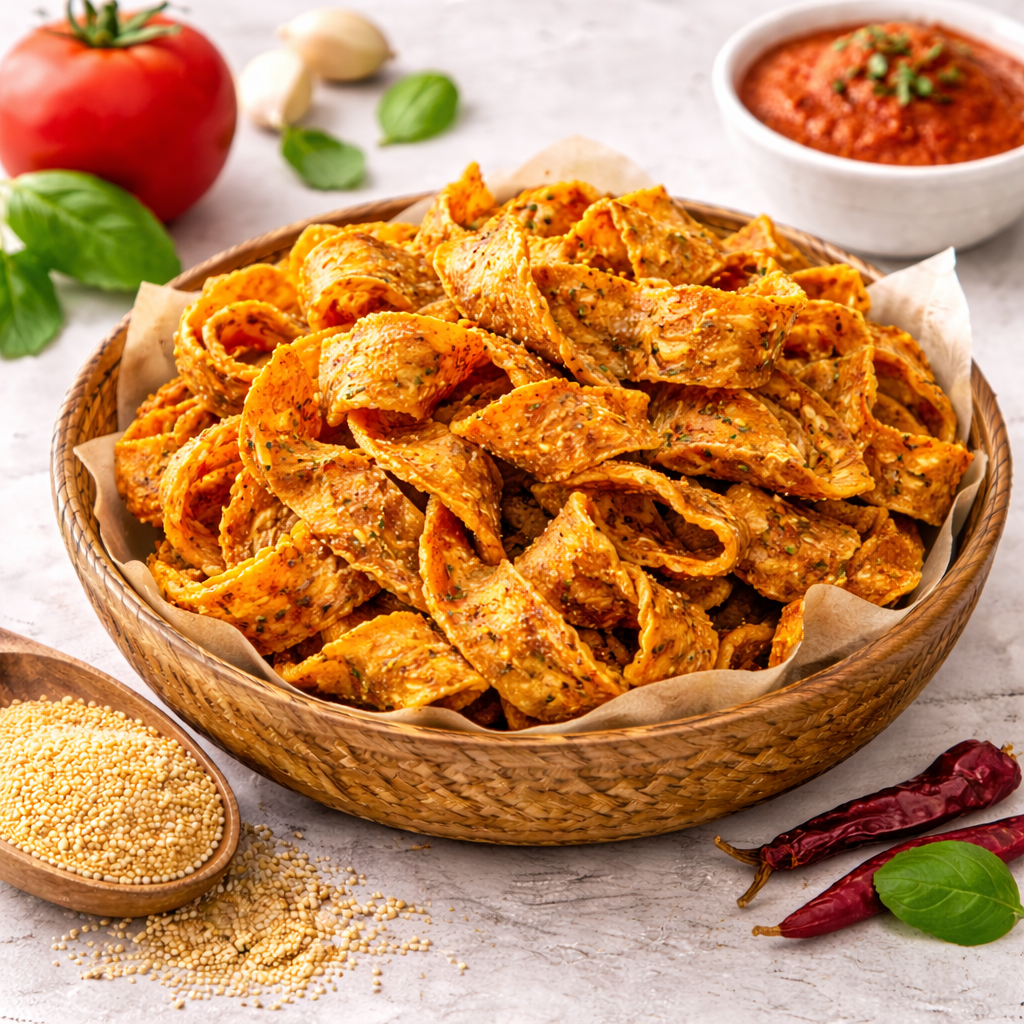Crispy ribbon snack infused with tomato flavour using foxtail millet.